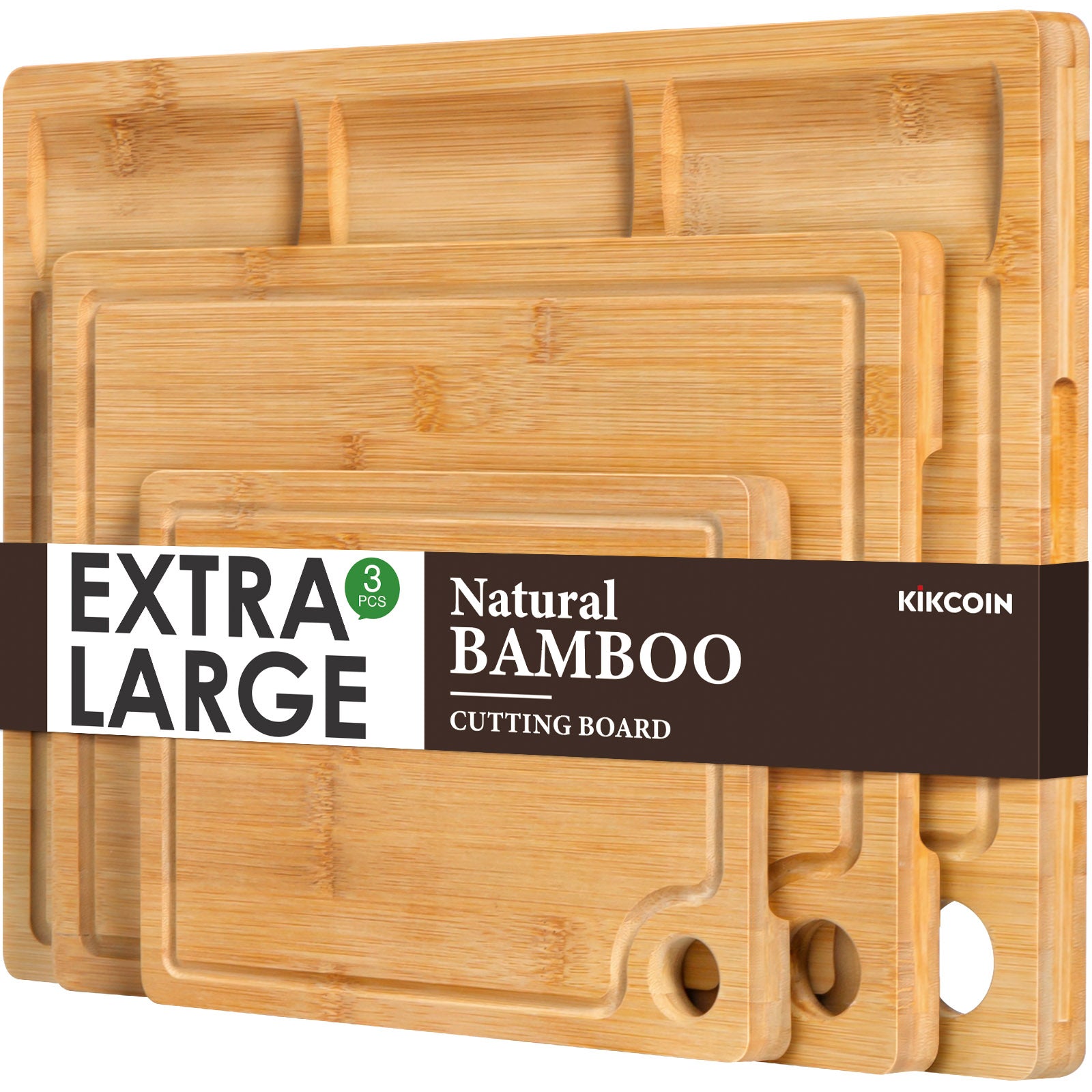 Bamboo Cutting Boards for Kitchen, (Set of 3) Kitchen Chopping Board with 3 Built-In Compartments and Juice Groove Heavy Duty Serving Tray Wood Butcher Block and Wooden Carving Board, Kikcoin