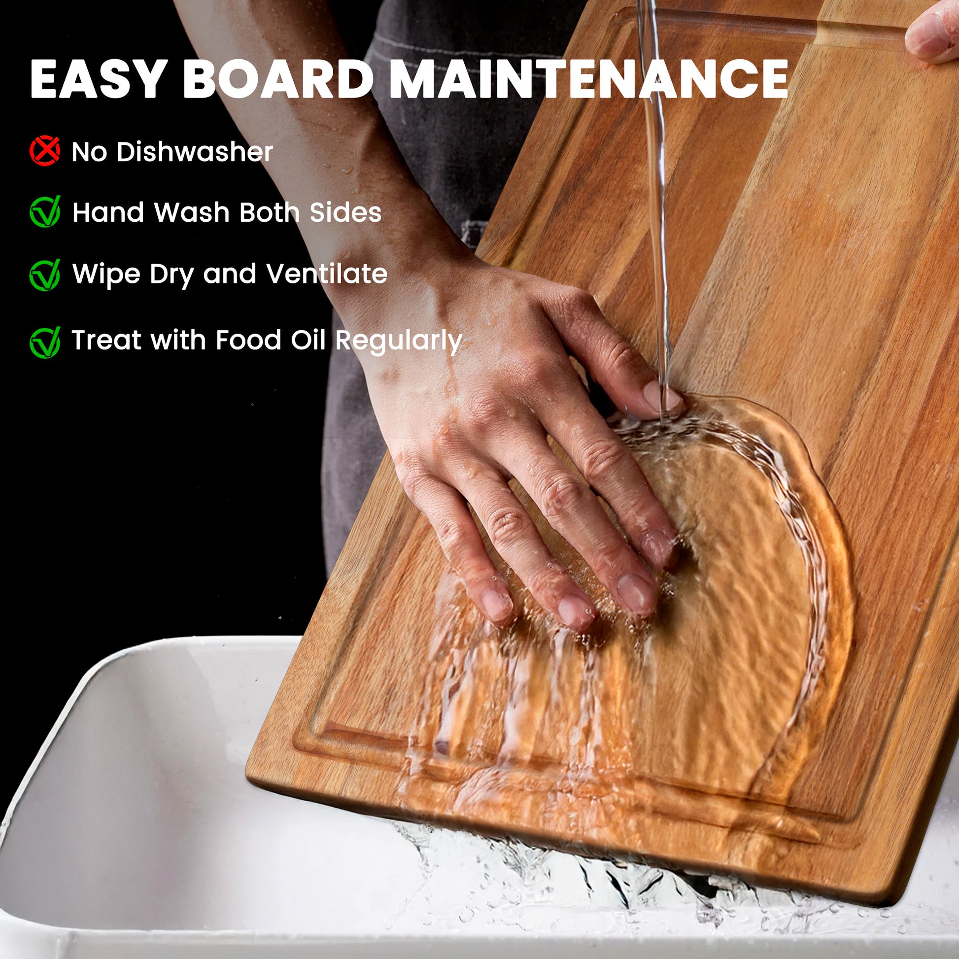 **Easy to Clean and Maintain:** Cleaning a wooden chopping board is simple. Wooden boards do not retain odors or stains, making them easy to care for. It is recommended to hand wash them with warm water and mild soap. After washing, dry the board thoroughly and store it in a well-ventilated area. Regularly applying food-safe oil can significantly extend the lifespan of the wood.