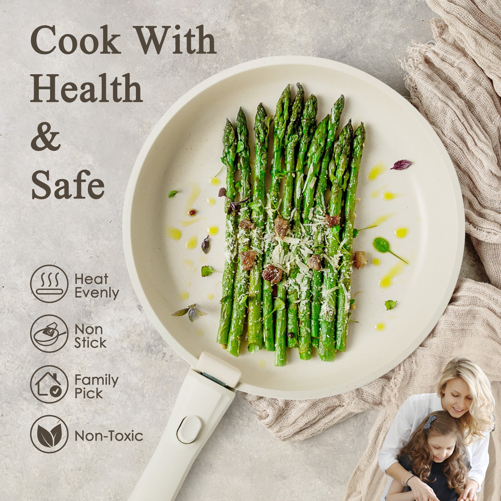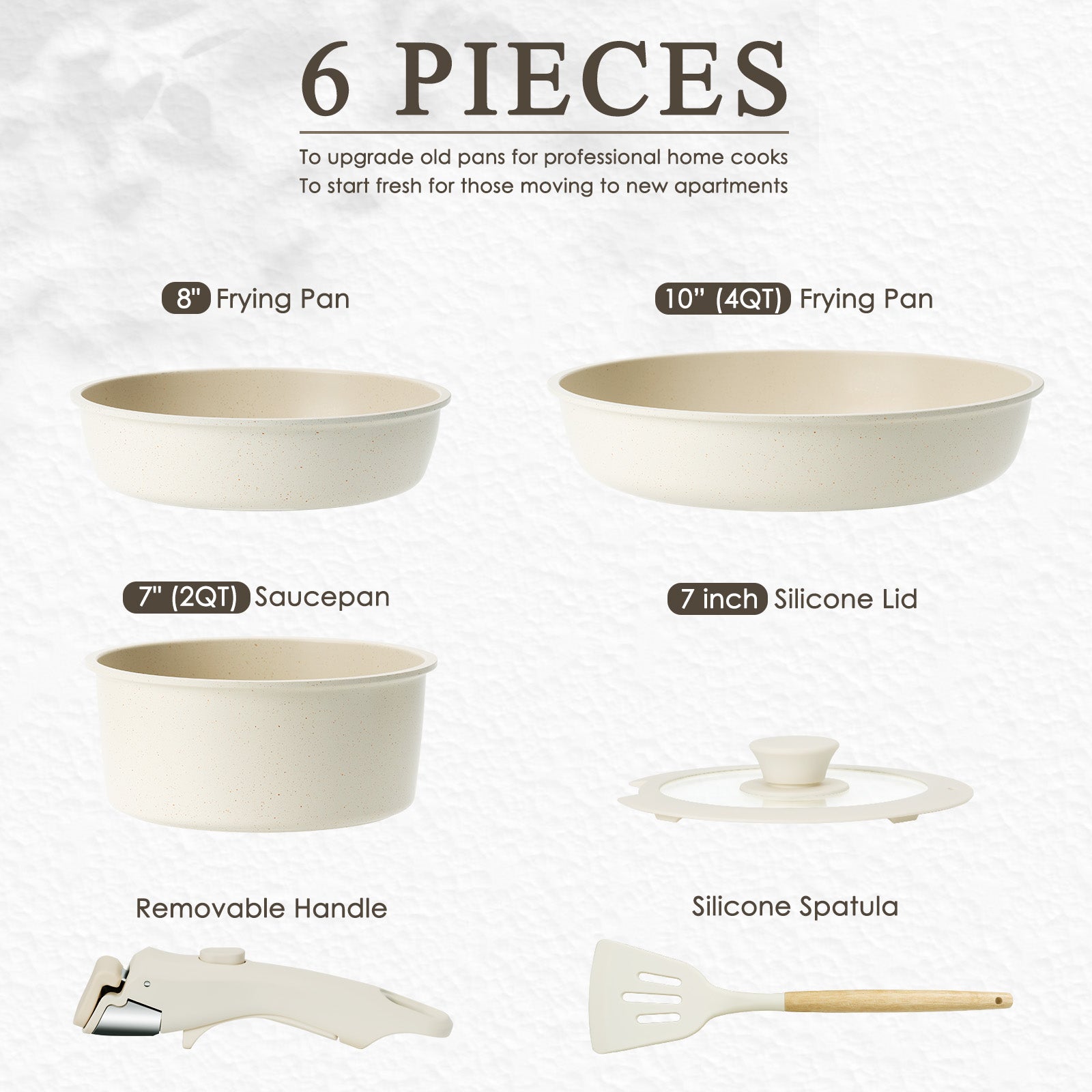 If you're searching for a cookware set that fits well in small apartments, this 6-piece pots and pans set with lids is an excellent choice. It includes a 7-inch (2-quart) pan, an 8-inch skillet, a 10-inch large skillet, a 7-inch silicone-rimmed glass lid, a spatula, and a removable handle. This compact set won’t take up much space while efficiently meeting your everyday cooking needs.