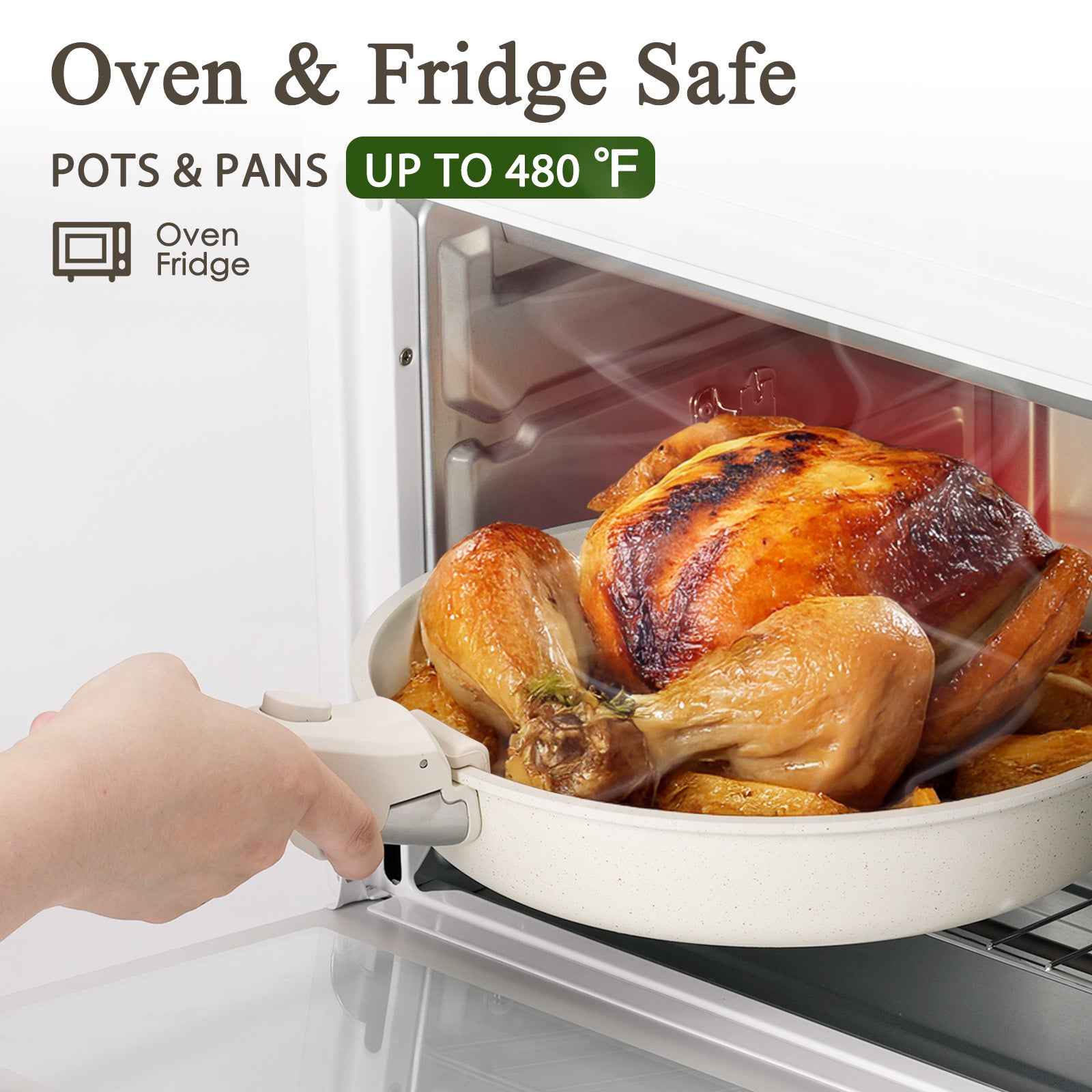 Looking for cookware for a small apartment, RV, or compact kitchen? This set with removable handles is ideal. The upgraded handles have an enhanced weight capacity, able to support up to 24 pounds securely. This feature makes it easy to transfer pots and pans to the oven, refrigerator, or stovetop. Additionally, the stackable set saves up to 75% of your kitchen space, and storage and cleaning are more convenient too!