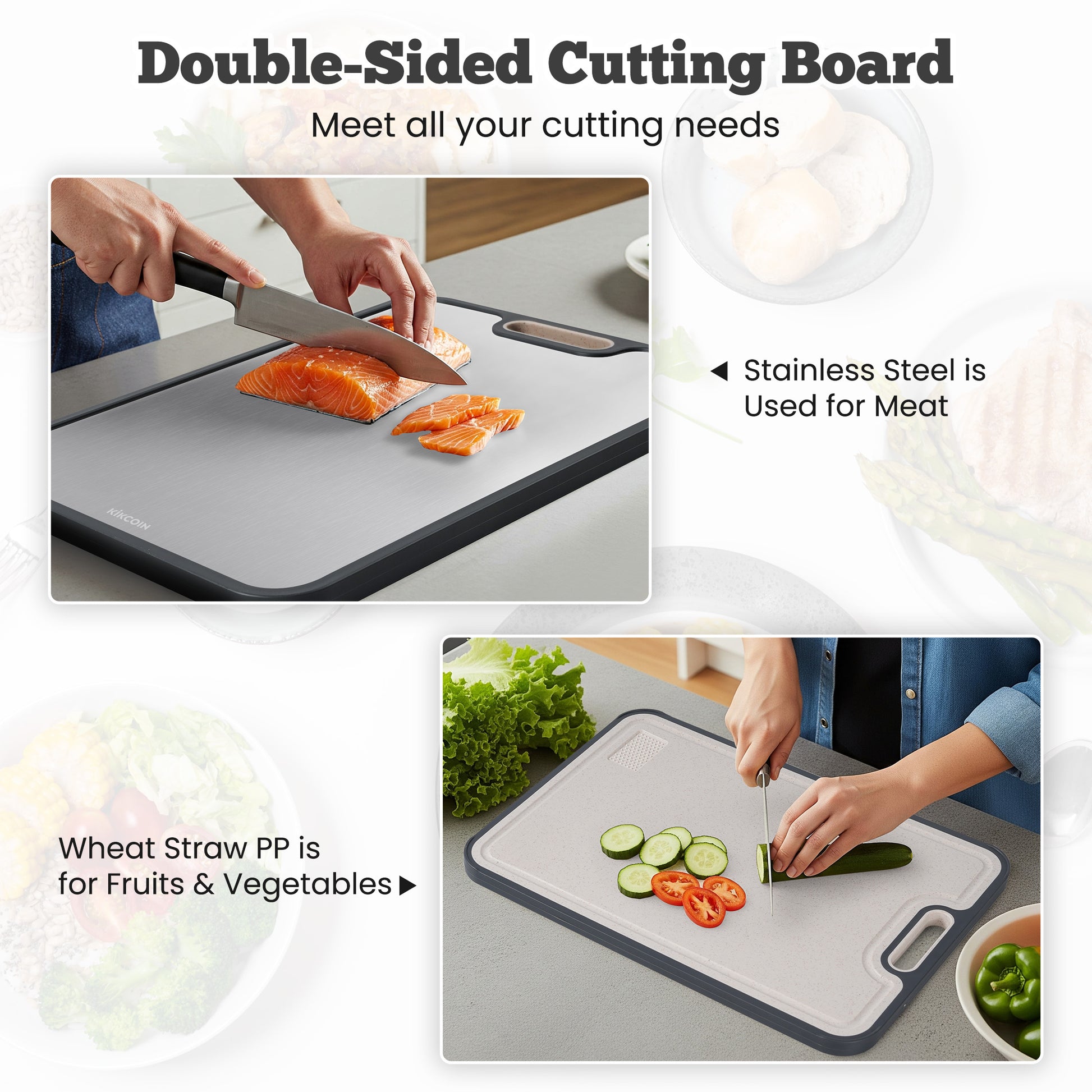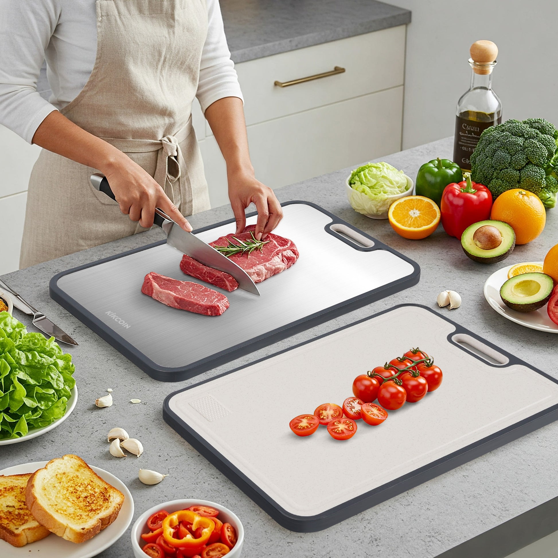This cutting board features a double-sided design, combining plastic and 304 stainless steel. This allows you to easily separate meat and vegetables, catering to various food preparation needs.